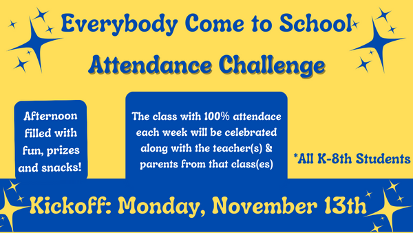 AOW is kicking off its first Attendance Challenge for all students K-8. Each week classes will compete to have 100% attendance. Classes with 100% attendance will will prizes, and the teacher(s) and parents can also win prizes as well! Kick-off begins Monday, November 13th. Please make sure that your student(s) are here to participate in all the activities that day. There will be an afternoon filled with fun, snacks & prizes!